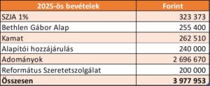 A Jókay Alapítvány 2025-ben folytatta hagyományait azzal, hogy 3,97 millió forintos bevételének 68%-a adományokból származik. Az alapító hozzájárulásával, kamattal és az SZJA 1%-a felajánlásával bevételünk 89%-a saját erőfeszítésünk, valamint adakozóink bőkezűsége eredménye. Köszönjük a magánszemélyeknek közel 2,7 millió forint adományt! A Bethlen Gábor Alaptól pedig 6%, vagyis 255.000 forint érkezett működésünk támogatásra az adományok utáni normatíva formájában. A Magyar Református Szeretetszolgálattól 200.000 forintot kaptunk szórvány gyülekezetek támogatására.