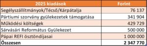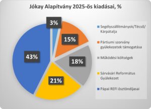 Kiadási oldalon a három fő célra (Pápai Református Kollégium, Sárvásári gyülekezet, valamint kárpátaljai és szórványsági segélyek) 1,91 millió forintot tudtuk költeni, ami a kiadásaink 82%-át teszi ki. A maradék 18%-ot a működésre fordítottuk. Az év végi 1,63 millió maradványból 2026. márciusában további 700.000 forintot Sárvásárba küldtünk, és közel 200.000 forintot költöttünk partiumi gyülekezetek támogatására.